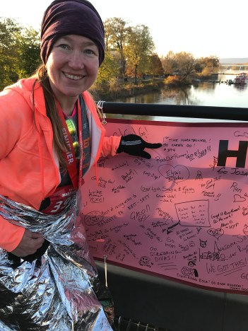• River Runners is an informal running group in Harrisburg led by Michelle (my pre-race hugger) and Mike. Jeff (the gummy bear flagger) is also very active in this group. At packet pickup Friday night before the marathon, they encouraged River Runners to sign a banner that they hung right on the Walnut Street (pedestrian) Bridge. That was so meaningful & thoughtful! Mike is one of several key people who encouraged me to write this piece.