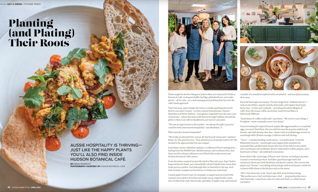 And that leads me to my latest story on the foodie beat: It was truly a treat to visit Hudson Botanical Cafe for Susquehanna Style magazine. In 15 years of foodie writing, I don’t think I have ever written about an Australian-owned restaurant, or one that also featured plants for sale. That alone makes it memorable in my book, but the excellence in flavors, menu and execution, along with the owners’ pure joy and friendliness makes it even more so. I will definitely go back, “off the clock!”