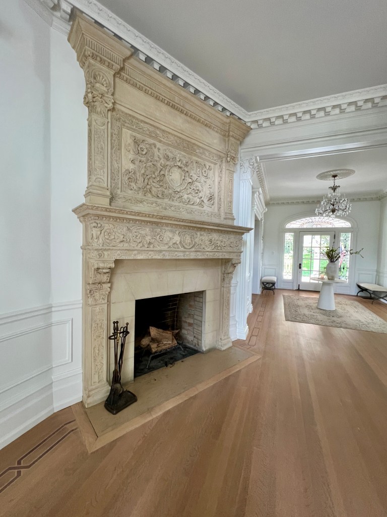 As Gabrielle gazed through the glass, into the home’s foyer, her eyes rested on the foyer’s original, circa-1912 carved sandstone fireplace.