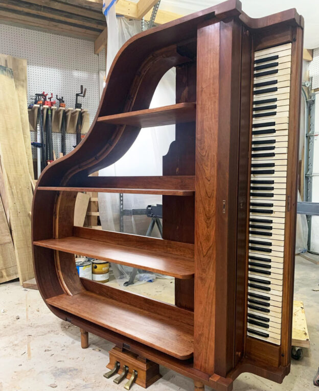“It was a challenge, adding cross-braces and figuring out the shapes, angles and curves that preserved the piano while adding shelves,” said Johnson, who gutted the piano’s inner workings, while preserving the ebony and ivory keyboard as the bookcase’s edge.